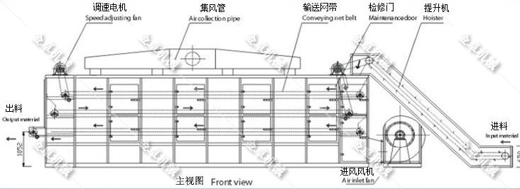 網(wǎng)帶烘干機(jī)主要原理是將物料均勻的平鋪在網(wǎng)帶上,網(wǎng)帶采用12-60目的鋼絲網(wǎng)帶,由傳動(dòng)裝置拖動(dòng)在干燥機(jī)內(nèi)往返移動(dòng),熱風(fēng)在物料間穿流而過(guò),水蒸氣從排濕孔中排出,從而達(dá)到干燥的目的,箱體長(zhǎng)度由標(biāo)準(zhǔn)段組合而成,為了節(jié)約場(chǎng)地,可將烘干機(jī)制成多層式,常見的有二室三層、二室五層、長(zhǎng)度6-40m,有效寬度0.6-3.0m。