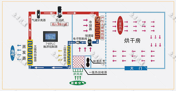 6、通風(fēng)排濕設(shè)備:保持空氣在供熱室和物料室循環(huán)流動和實(shí)現(xiàn)烘干設(shè)備、烘干箱內(nèi)空氣交換、維持物料室內(nèi)烘烤工藝要求的設(shè)備。包括冷風(fēng)進(jìn)風(fēng)門,排濕口等,設(shè)備型號不同通風(fēng)排濕形式有所不同。